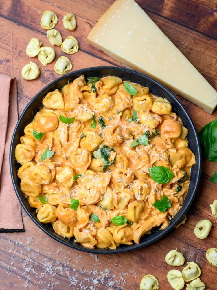 • Freeze: Best to freeze before adding tortellini (they can go mushy). Store the sauce and chicken for up to 2 months.