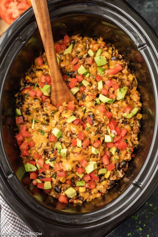 Add the meat (or lentils), beans, corn, tomatoes, salsa, onion, taco seasoning, and rice into your slow cooker. Stir well. Add about ½ cup of water or broth if it looks a bit dry.